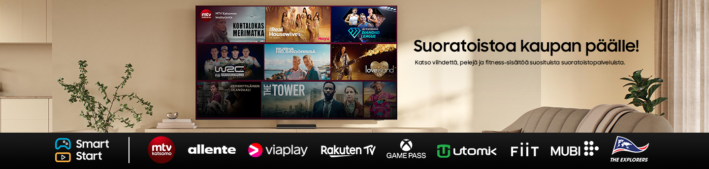 * Voimassa ostaessasi jonkin valikoiduista projektorimalleista tai valikoiduista vuoden 2024 Samsung-televisioista 29.4.2024–31.03.2025. Rajoituksia sovelletaan. Sisältyvät suoratoistopalvelutarjoukset voivat vaihdella kampanjan aikana. Ehdot kokonaisuudessaan.