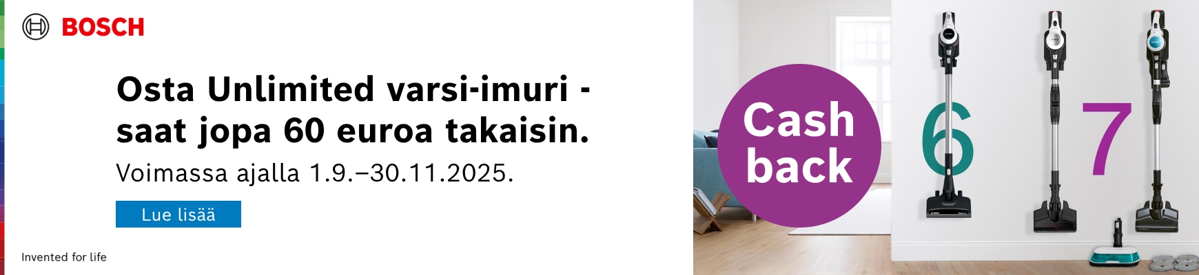 Saat jopa 80 euroa takaisin, kun ostat ja rekisteröit uuden Bosch Unlimited -varsi-imurin.