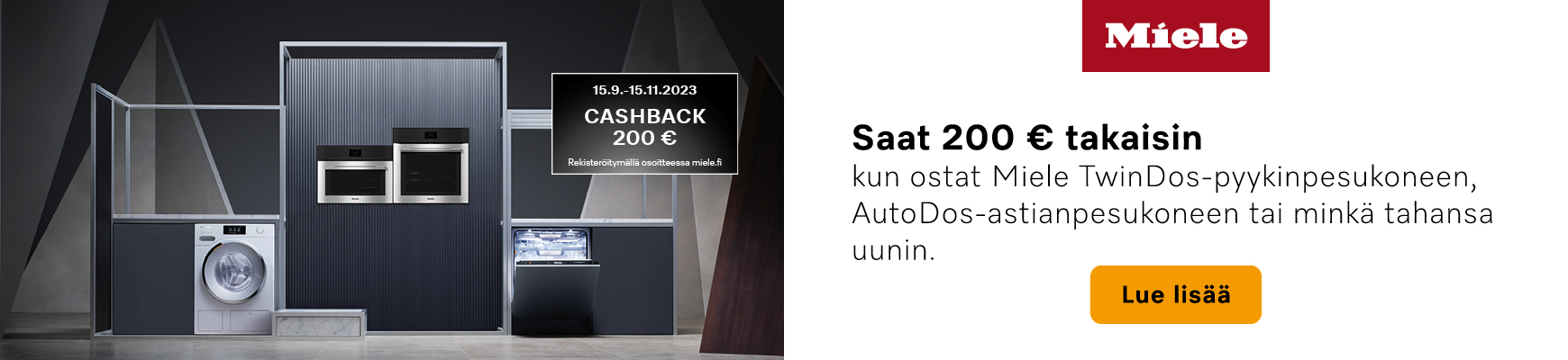Laadukkaisiin Miele kodinkoneisiin kannattaa investoida. Miele antaa 200 € rahaa takaisin, kun ostat Miele TwinDos-pyykinpesukoneen, AutoDos-astianpesukoneen tai uunin kampanja-aikana (15.9. - 15.11.2023).