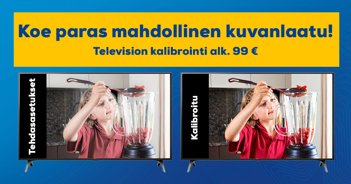 Uuden television kuvanlaatu ei ole täydellinen ensimmäisellä käynnistyskerralla. Television kalibrointi mahdollistaa parhaan mahdollisen kuvanlaadun. Television kontrasti, harmaansävyt ja värit saadaan kalibroinnin avulla sellaisiksi, joiksi materiaalin valmistaja on ne tarkoittanut. Kalibrointipalvelun voi tilata erikseen määritellyille malleille television oston tai tilauksen yhteydessä. Lue lisää television kalibroinnista.