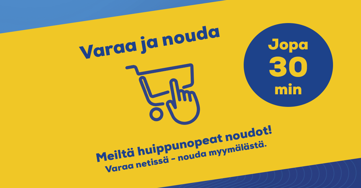 Etsi tuote nettikaupasta. Klikkaa Varaa ja nouda -painiketta.Tämän jälkeen pystyt omalla postinumerolla löytämään lähimmän myymälän, josta tuote on saatavilla. Tuote maksetaan noudon yhteydessä myymälässä. Varaaminen on maksutonta ja varaus on voimassa 24 tuntia.