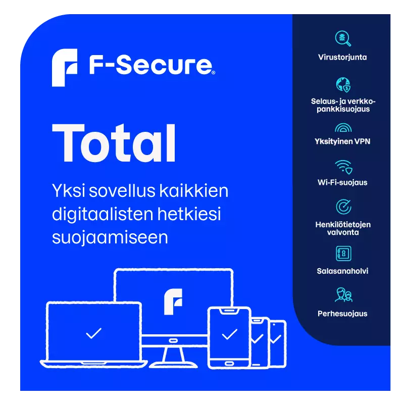 Hanki kattava tietoturva, yksityisyyden ja henkilötietojen suojaus sekä vanhempien käytönvalvontaominaisuudet lapsille F-Secure Totalilla – ja käytä niitä yhdellä ja samalla sovelluksella.