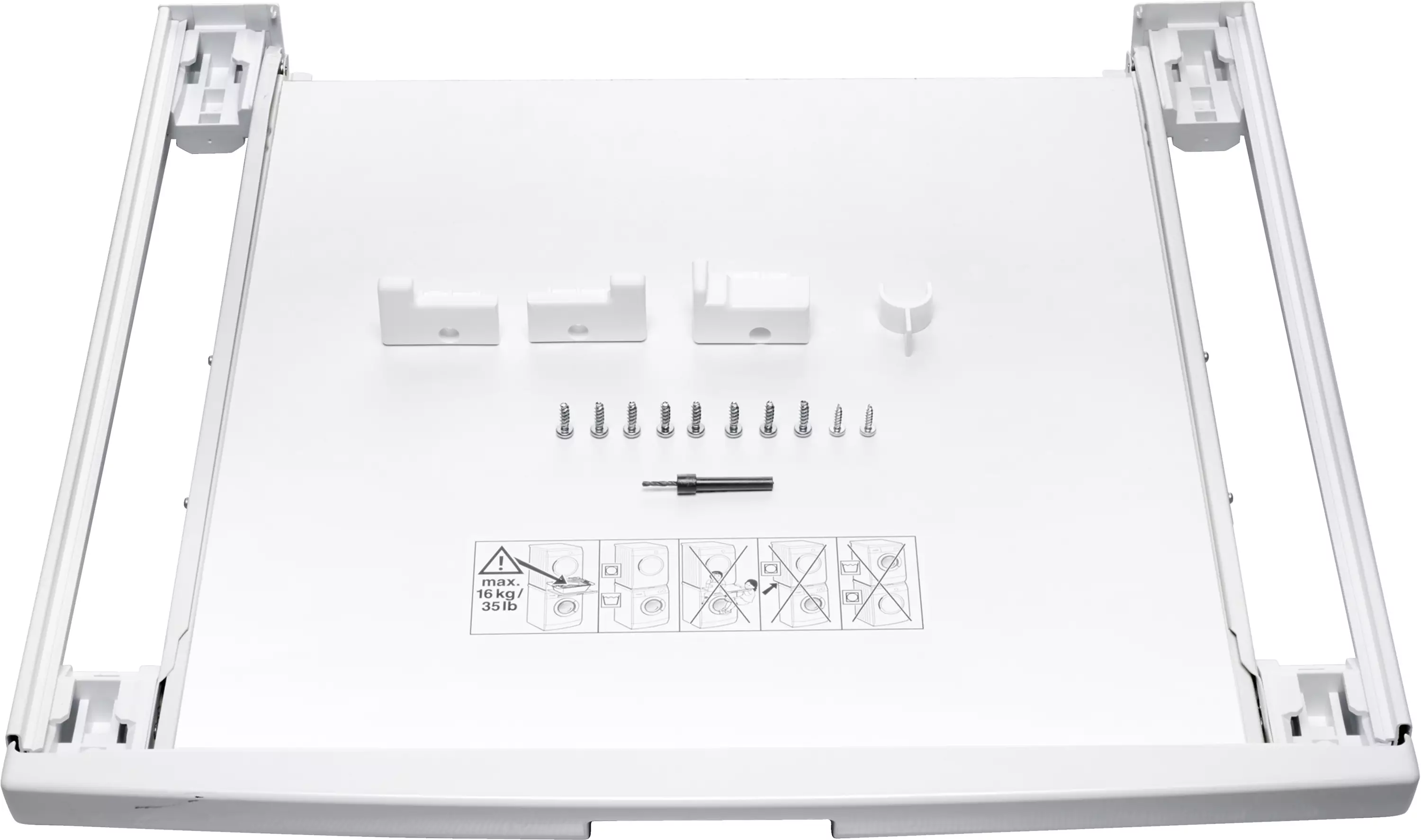 Välisarja ulosvedettävällä tasolla kuivausrummun kiinnittämiseen pesukoneen päälle. Liitossarja ulosvedettävällä laskutasolla. Sopii laitteisiin Bosch WTW, WTB, WTY, WTH