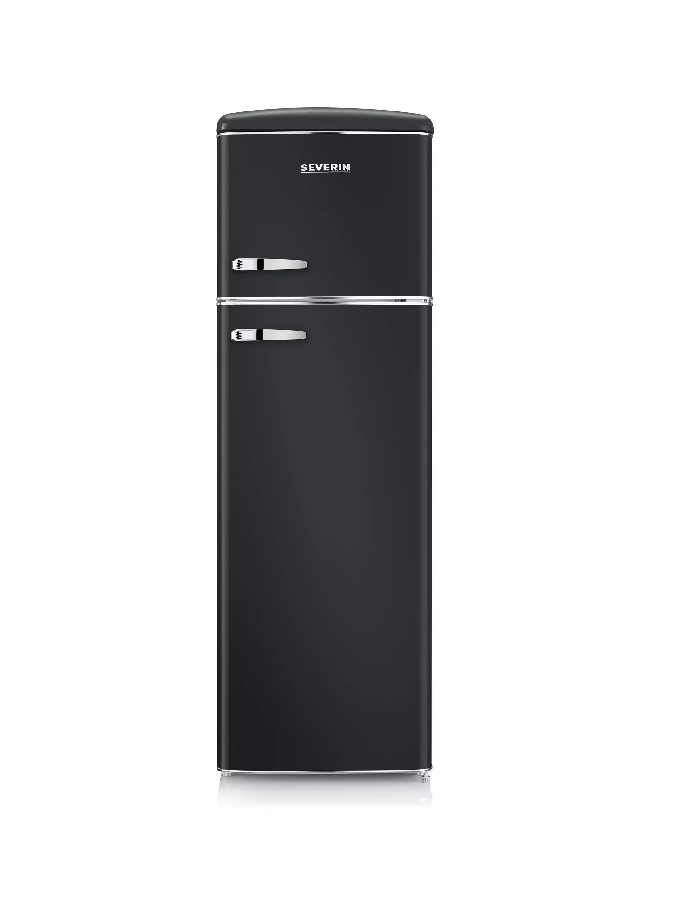 Severin RGK8984 – tämä musta, retrohenkinen jääkaappi-pakastin, jossa on krominvärinen kahva, varastaa huomion jokaisessa kodissa.