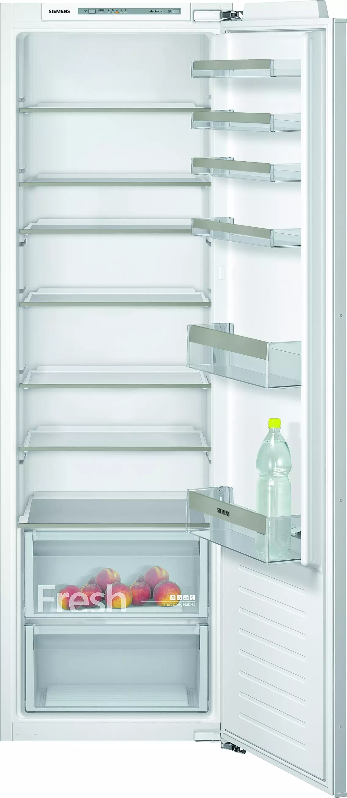Suorituskyky ja kulutus Energialuokka: F. Energiankulutus: 116 kWh kWh/vuosi Käyttötilavuus yhteensä: 319 l Äänitaso: 37 dB(A) re 1 pW Design LED-valaistus jääkaapissa Mukavuus ja turvallisuus Elektroninen lämpötilanohjaus ja LED-näyttö freshSense-sensoriautomatiikka kaapin sisä- ja ulkopuolella reagoi lämpötilan muutoksiin ja takaa jatkuvan tasaisen säilytyslämpötilan Automaattisulatus jääkaapissa Pikajäähdytys, joka palautuu automaattisesti normaalitilaan Jääkaappiosa Jääkaapin käyttötilavuus: 319 l 7 turvalasihyllyä, joista 6 korkeudeltaan säädettävissä Tuoresäilytys Kaksi freshBox-vihanneslaatikkoa. Mitat Mitat (K x L x S): 177 x 54 x 55 cm Asennusmitat: (H x B x T): 177.5 cm x 56.0 cm x 55.0 cm Tekniset tiedot Ovi aukeaa oikealle, avaussuunta vaihdettavissa Bruttotilavuus: 321 l Ympäristö ja Turvallisuus