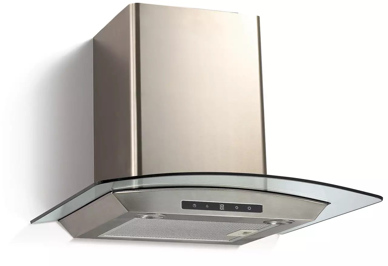 Tyylikäs seinälle asennettava liesituuletin kaarevalla kirkkaalla lasilla ja ruostumattomalla teräksellä