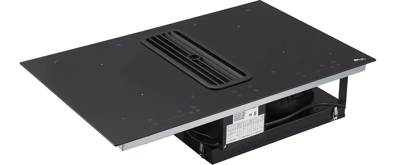 Liesituuletin on sijoitettu keskelle tasoa, ja sen hiljainen mutta tehokas Eco-moottori imee käryt ja höyryt suoraan alas. Imuteho yltää jopa 623 m³/h ja testattu höyrynsieppaus on yli 75 %, mikä varmistaa puhtaan ja raikkaan ilman. Konepestävä metallisuodatin tekee puhdistuksesta helppoa, ja jälkikäyntitoiminto viimeistelee ilmanvaihdon käytön jälkeen.