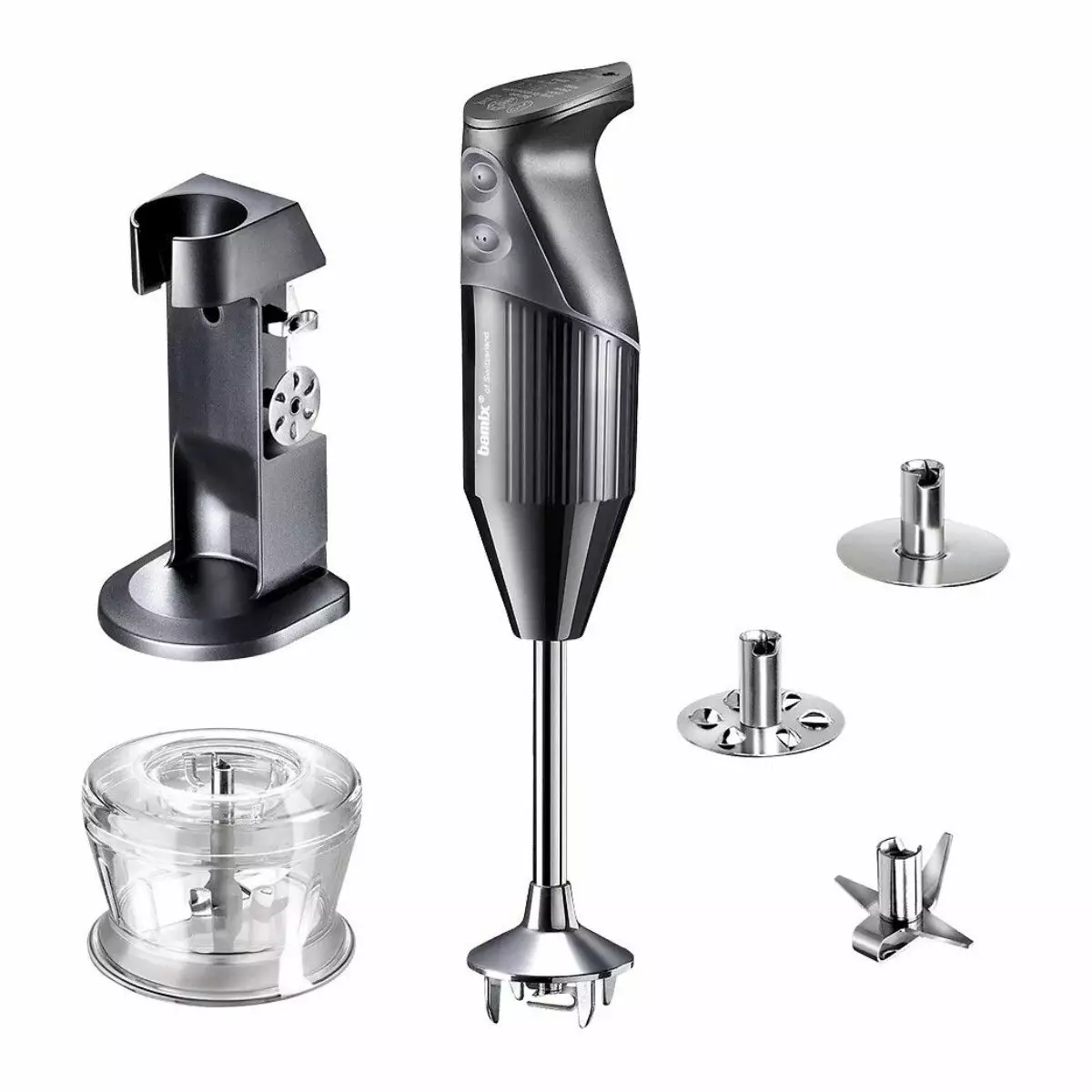 - Pakkauksen sisältö: Bamix® M200 sauvasekoitin (200W), yleisterä, soseutuslevy, vaahdotuslevy, mylly, pöytäteline