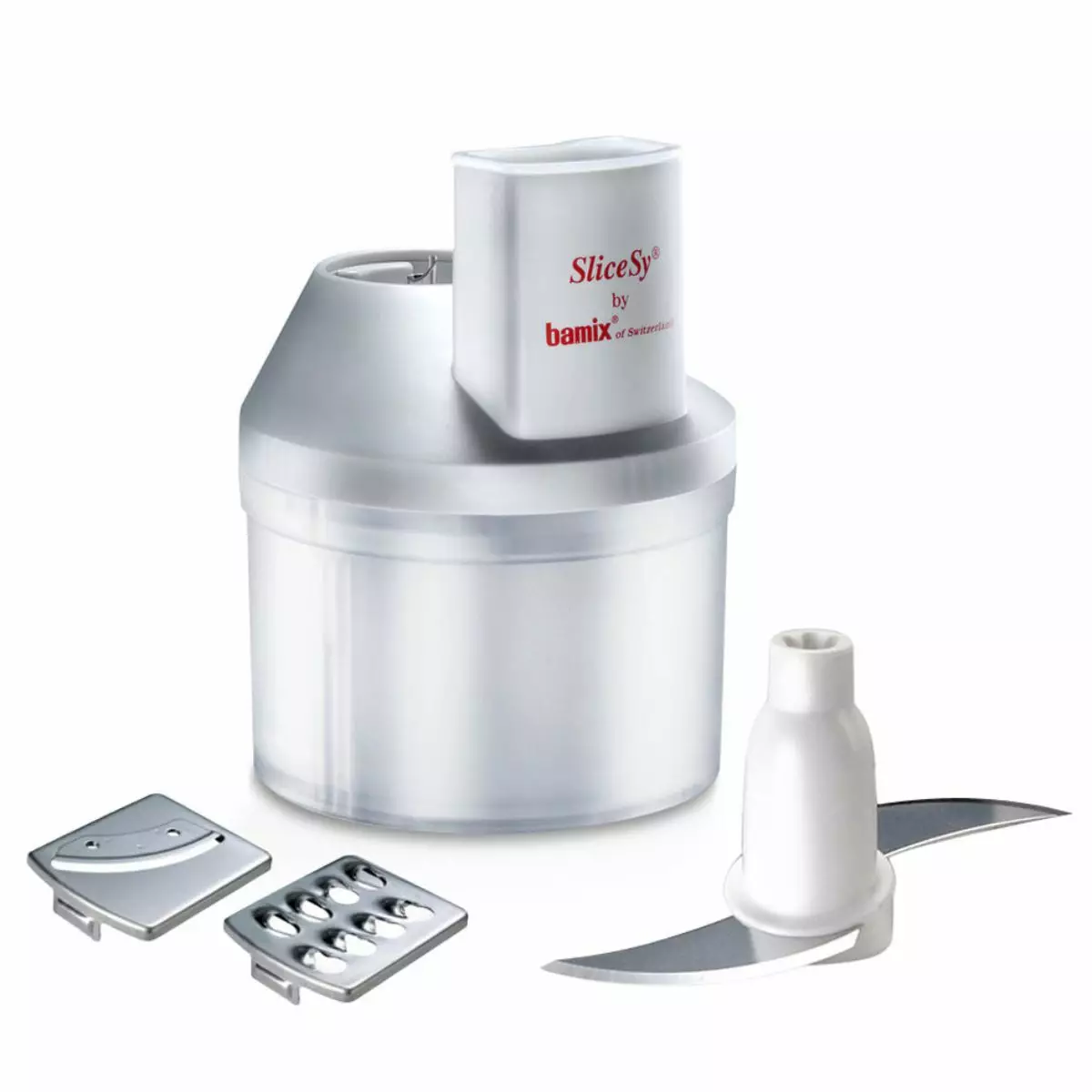 Bamix SliceSy® on kätevä lisälaite, joka muuntaa kaikki Bamix-sauvasekoittimet minikokoiseksi monitoimikoneeksi. Tämä viipalointi- ja raastinlaite mahdollistaa nopean ja vaivattoman juuston, porkkanoiden ja muiden ainesten käsittelyn.