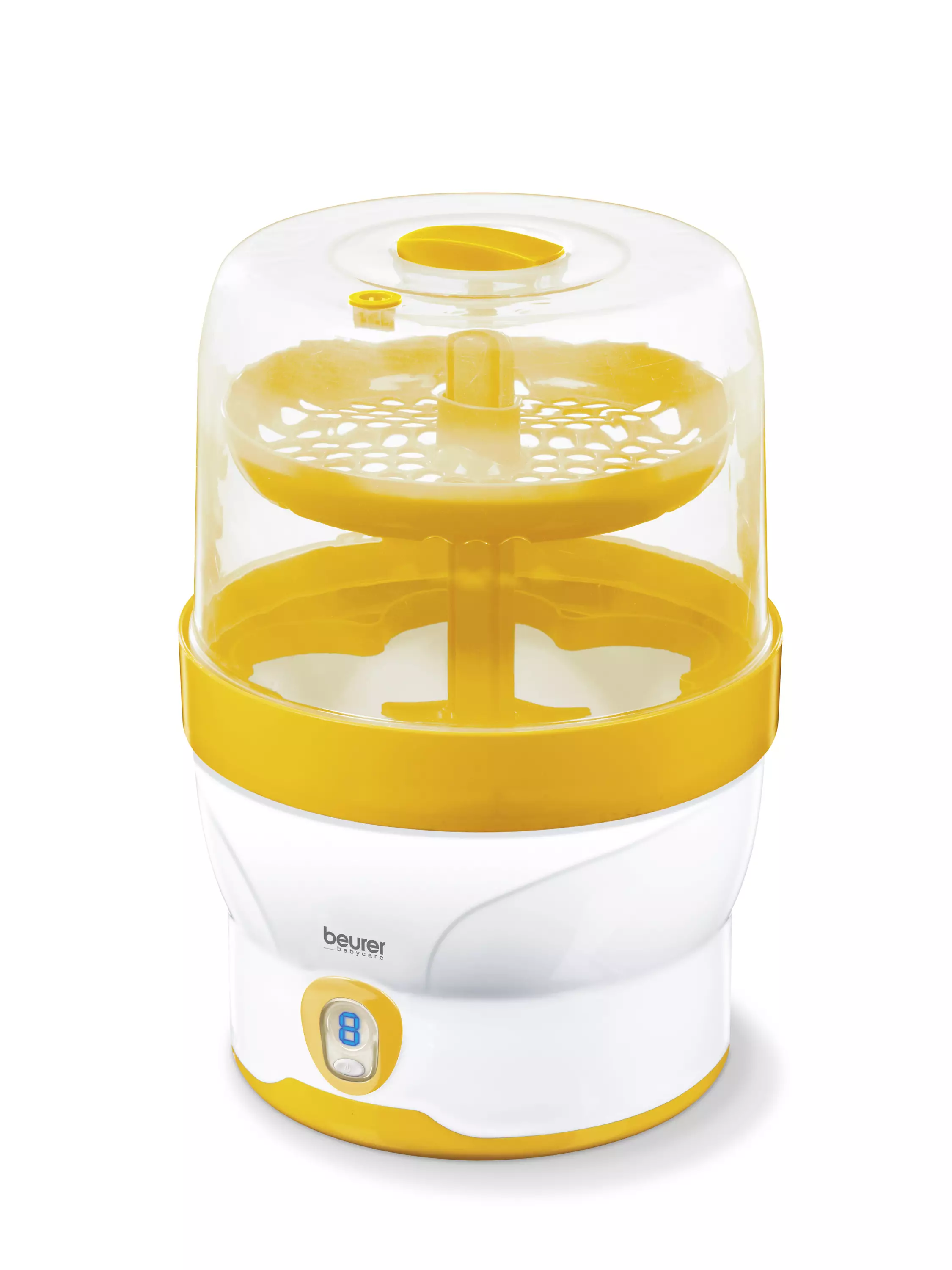 Etsitkö tehokasta ja kätevää tapaa steriloida vauvan tuttipullot? Beurer BY76 digitaalinen tuttipullojen steriloija tarjoaa luotettavan ratkaisun. Tämä höyrysterilointilaite desinfioi jopa 6 pulloa nopeasti ja tehokkaasti noin 7 minuutissa, tehden siitä nopeimman sterilointitavan. Sen helppokäyttöinen muotoilu tekee siitä kätevän ja selkeä LED-näyttö ilmoittaa steriloinnin kuluvan ajan. Steriloidut pullot pysyvät steriileinä jopa 3 tuntia, mikäli laitteen kantta ei avata. Turvallinen käyttää, sillä laite steriloi ilman kemiallisia aineita, ja optinen ja akustinen signaali ilmoittaa kun sterilointi on valmis.
