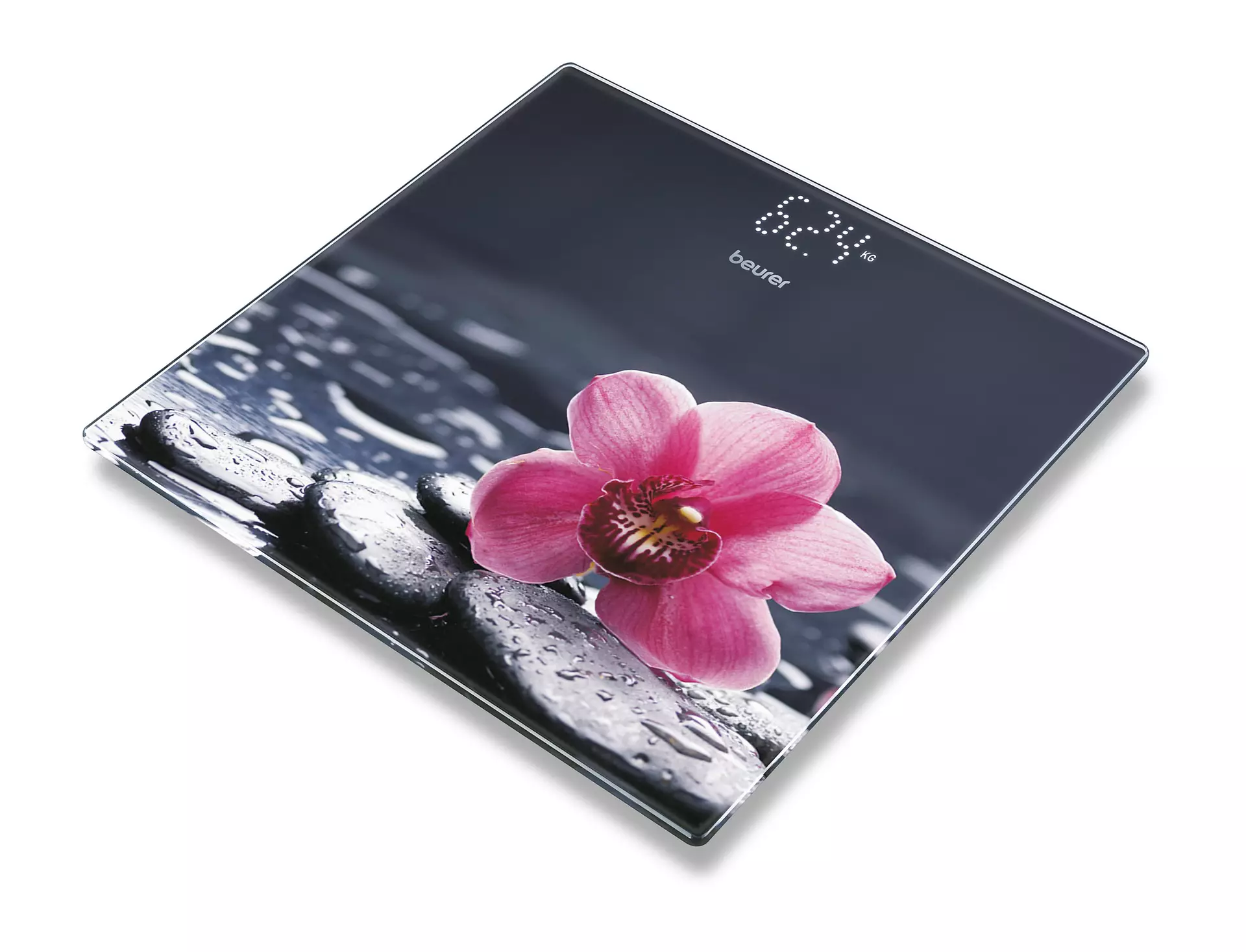 Tyylikäs lasivaaka, jossa on valkoinen, helppolukuinen “maaginen” näyttö: näkymätön näyttö – näkyy vain mittauksen aikana.