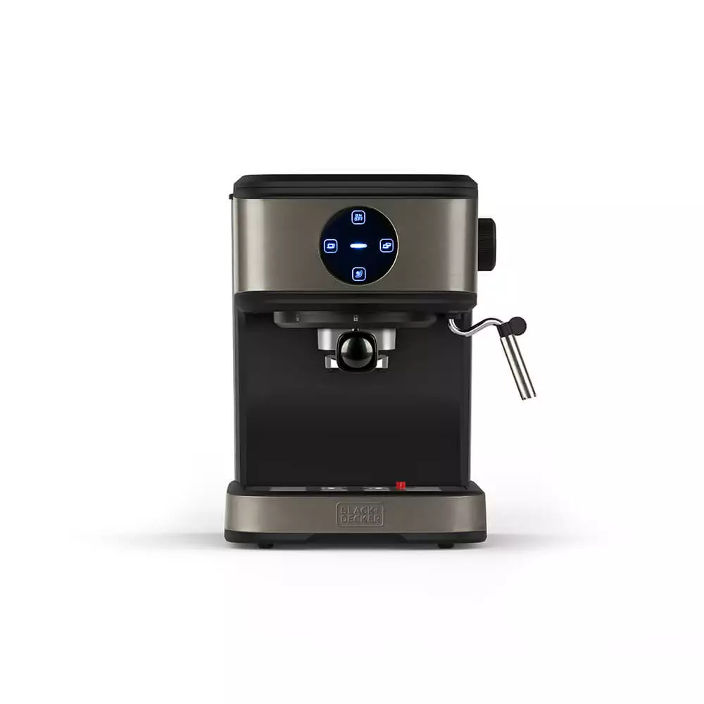 Espresson laatuun lisätään koneen laatu ja lisäominaisuudet. Black+Decker espressokeittimessä on tyylikäs sormenjälkiä estävä ruostumattomasta teräksestä valmistettu viimeistely, jonka päällä on kuppialusta, joka pitää kahvikupit lämpiminä, sekä helposti irrotettava tippa-alusta ja alumiininen tyhjennys. Se sisältää myös mittalusikan jauhettua kahvia varten, 1,5 litran säiliön, jossa on näkyvä vesitaso ja, joka on täysin irrotettava täyttöä varten. Lisäksi liukumattomat jalat lisäävät vakautta. Sen kompaktit mitat ovat 27 x 20,5 x 29 cm.