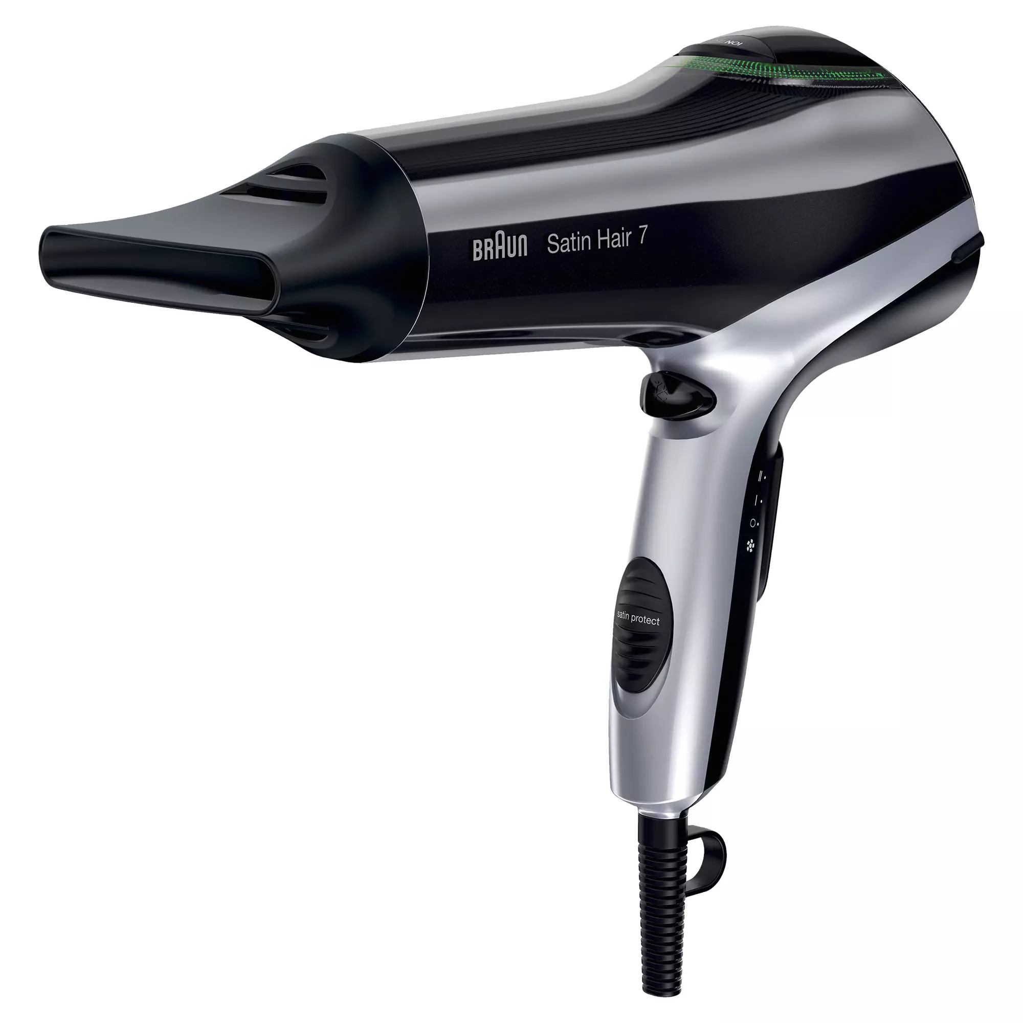 2200W, 3/2 lämpö-/puhallusasetusta. IONTEC, Braunin Satin Ion-tekniikan tuottama ionivirta rauhoittaa hiusta, vähentää pörröisyyttä ja staattisuutta paljastaen hiusten luonnollisen kauneuden ja kiillon.