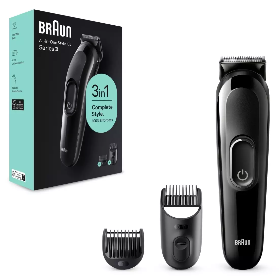 Pidä huolta parrasta ja hiuksista Braun All-in-One - Series-3. 2-in-1 hoitosetti parralle ja hiuksille. Braun Styling Kit SK2400 - Black -tuotteen edut: 2-in-1 muotoilusetti Braunilta parran ja kasvojen karvojen poistoon: partatrimmeri, vartalotrimmeri, hiustrimmeri ja hiustenleikkuukone yhdessä - valikoidut työkalut parran ja hiusten muotoiluun kotona Vaivaton muotoilu: Erittäin terävä terä leikkaa tehokkaasti jokaisella vedolla, myös vaikeapääsyisissä kohdissa, takaa loistavan lopputuloksen ja mukavan parran, kasvojen ja hiusten muotoilun Helppo muotoilu pituudesta riippumatta: Erinomainen lopputulos kiinteällä kammalla (1 mm) ja säädettävällä kammalla (3-11 mm) Valmiina käyttöön: Miesten vartalonhoitosetti sisältää tehokkaan NiMH-akun, joka tarjoaa 50 minuutin langattoman käyttöajan Helppo puhdistus: Laitteessa on pestävät trimmeripäät ja kampalisäkkeet sekä puhdistusharja