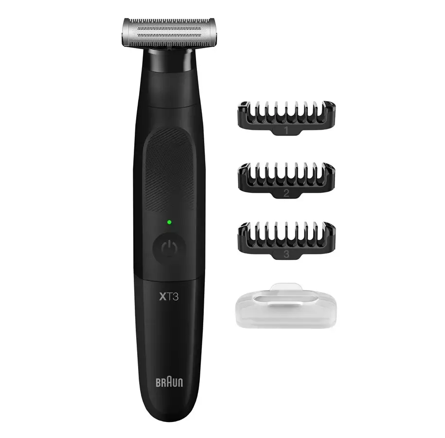 Braun Series XT3 on partatrimmeri ja parranajokone, kaikki yhdessä laitteessa kasvoille. Sen 4D-terä tarjoaa helpon ja miellyttävän ajon ärsyttämättä ihoa. Täysin vesitiivistä trimmeriä ja parranajokonetta voi käyttää märkänä tai kuivana, ja sen metallinen terä on suunniteltu kestämään jopa kuusi kuukautta (perustuen kahteen ajokertaan viikossa, todelliset tulokset voivat vaihdella). Kapea muotoilu ja luistamaton ote tekevät siitä yllättävän helpon käsitellä. Pakkaus sisältää:1 partatrimmeri, 3 kasvokampaa (1, 3 ja 5 mm), 1 Smart plug