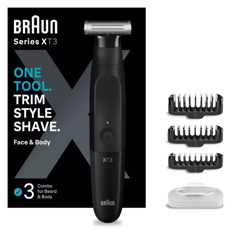 Braun Series XT3 on partatrimmeri ja parranajokone, kaikki yhdessä laitteessa kasvoille. Sen 4D-terä tarjoaa helpon ja miellyttävän ajon ärsyttämättä ihoa. Täysin vesitiivistä trimmeriä ja parranajokonetta voi käyttää märkänä tai kuivana, ja sen metallinen terä on suunniteltu kestämään jopa kuusi kuukautta (perustuen kahteen ajokertaan viikossa, todelliset tulokset voivat vaihdella). Kapea muotoilu ja luistamaton ote tekevät siitä yllättävän helpon käsitellä. Pakkaus sisältää:1 partatrimmeri, 3 kasvokampaa (1, 3 ja 5 mm), 1 Smart plug