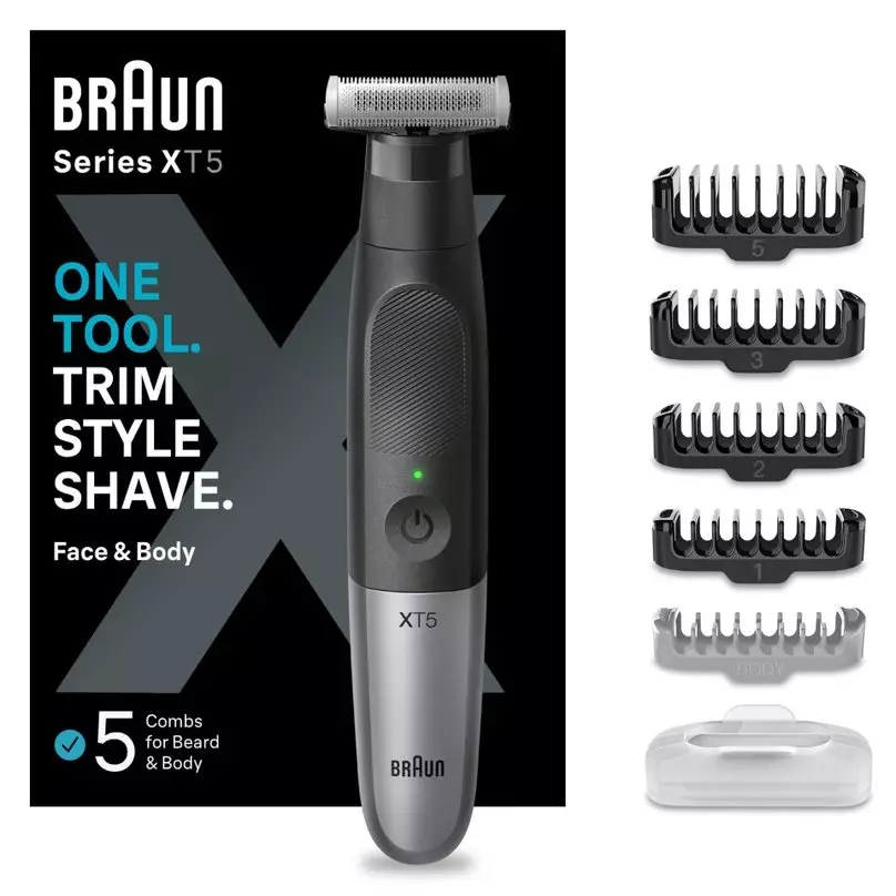 Braun Series XT5 on trimmeri, body groomer ja parranajokone samassa laitteessa kasvoille ja vartalolle. 4D-terä antaa helpon ja mukavan, iholle hellävaraisen ajon. Täysin vesitiivistä trimmeriä ja parranajokonetta voi käyttää märkänä tai kuivana. Metallinen terä on tehty kestämään jopa kuuden kuukauden ajan*. Kapea muotoilu ja luistamaton ote tekee laitteen käsittelystä hämmästyttävän helppoa.* Perustuu kasvojen karvoituksen ajoon kahdesti viikossa. Todelliset tulokset voivat vaihdella. Pakkaus sisältää:1 parranajokone 4 kasvokampaa (1 mm, 2 mm, 3 mm, 5 mm)1 SkinGuard-vartalokampa (hellävarainen)1 Smart plug.