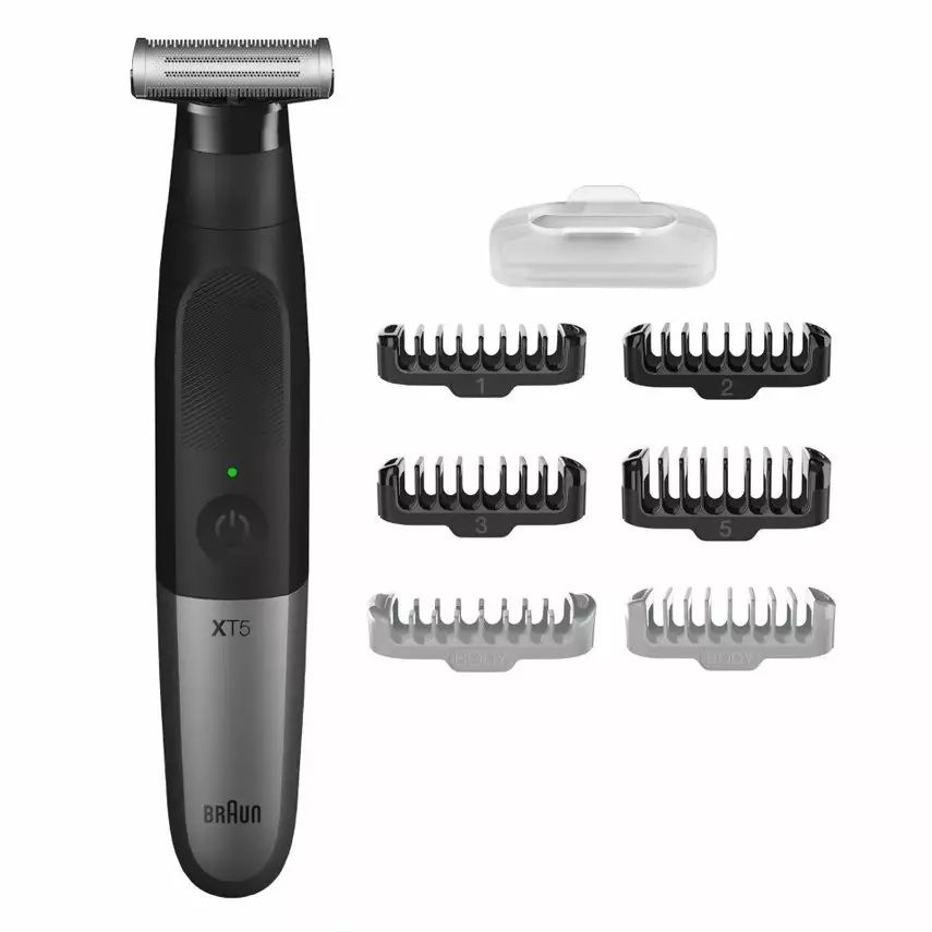 Braun Series XT5 on partatrimmeri, body groomer ja parranajokone - samassa laitteessa kasvoille ja vartalolle. 4D-terä antaa helpon ja mukavan, iholle hellävaraisen ajon. Täysin vesitiivistä trimmeriä ja parranajokonetta voi käyttää märkänä tai kuivana. Metallinen terä on tehty kestämään jopa kuuden kuukauden ajan*. Kapea muotoilu ja luistamaton ote tekee laitteen käsittelystä hämmästyttävän helppoa.* Perustuu kasvojen karvoituksen ajoon kahdesti viikossa. Todelliset tulokset voivat vaihdella. Pakkaus sisältää:1 parranajokone4 kasvokampaa (1 mm, 2 mm, 3 mm, 5 mm)2 vartalokampaa (0 mm SkinGuard, 3 mm)1 matkapussi1 Smart plug
