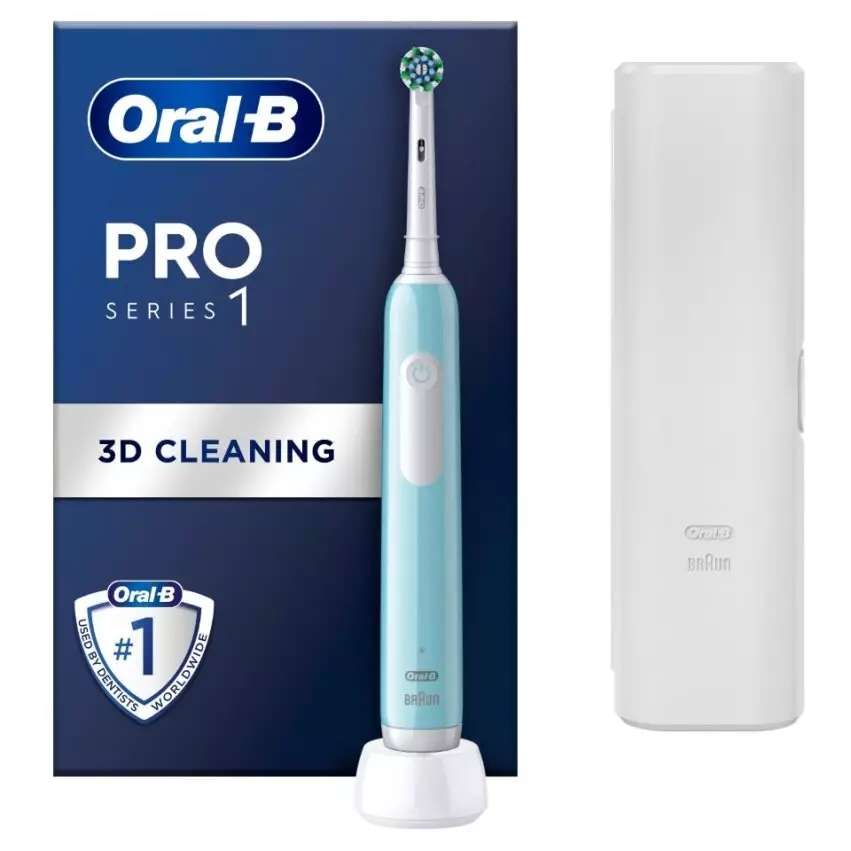 ORAL-B SÄHKÖHAMMASHARJA PRO1 TURQUOISE + MATKAKOTELO. PRO 1 -sähköhammasharja auttaa ammattimaisen ajastimen avulla harjaamaan 2 min ajan hammaslääkäreiden suosittelemalla tavalla ja muistuttaa 30 sekunnin välein hammasneljänneksen vaihtamisesta.