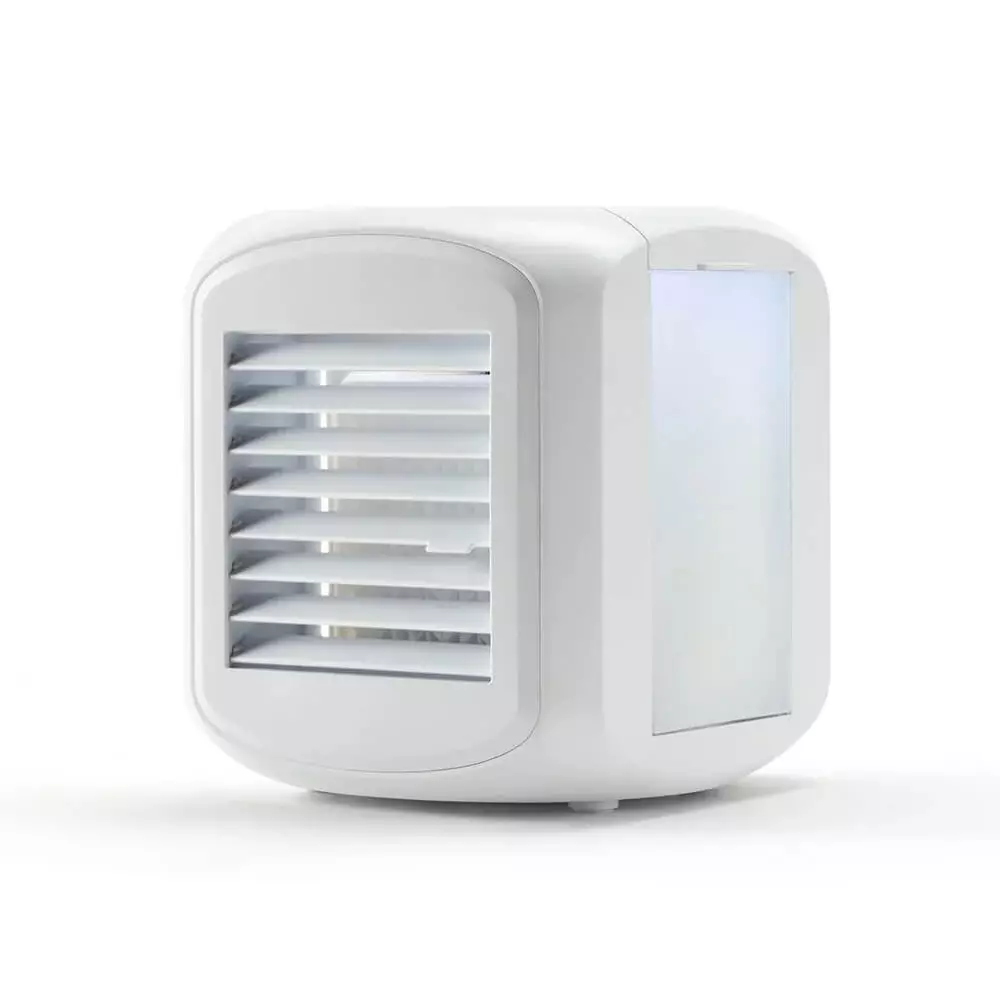 Tämä minijäähdytin viilentää, tuulettaa ja kostuttaa ympäröivää ilmaa, sekä tarjoaa 7 värillisen valonsa ansiosta myös lisähyvinvointia ja rentoutumista.