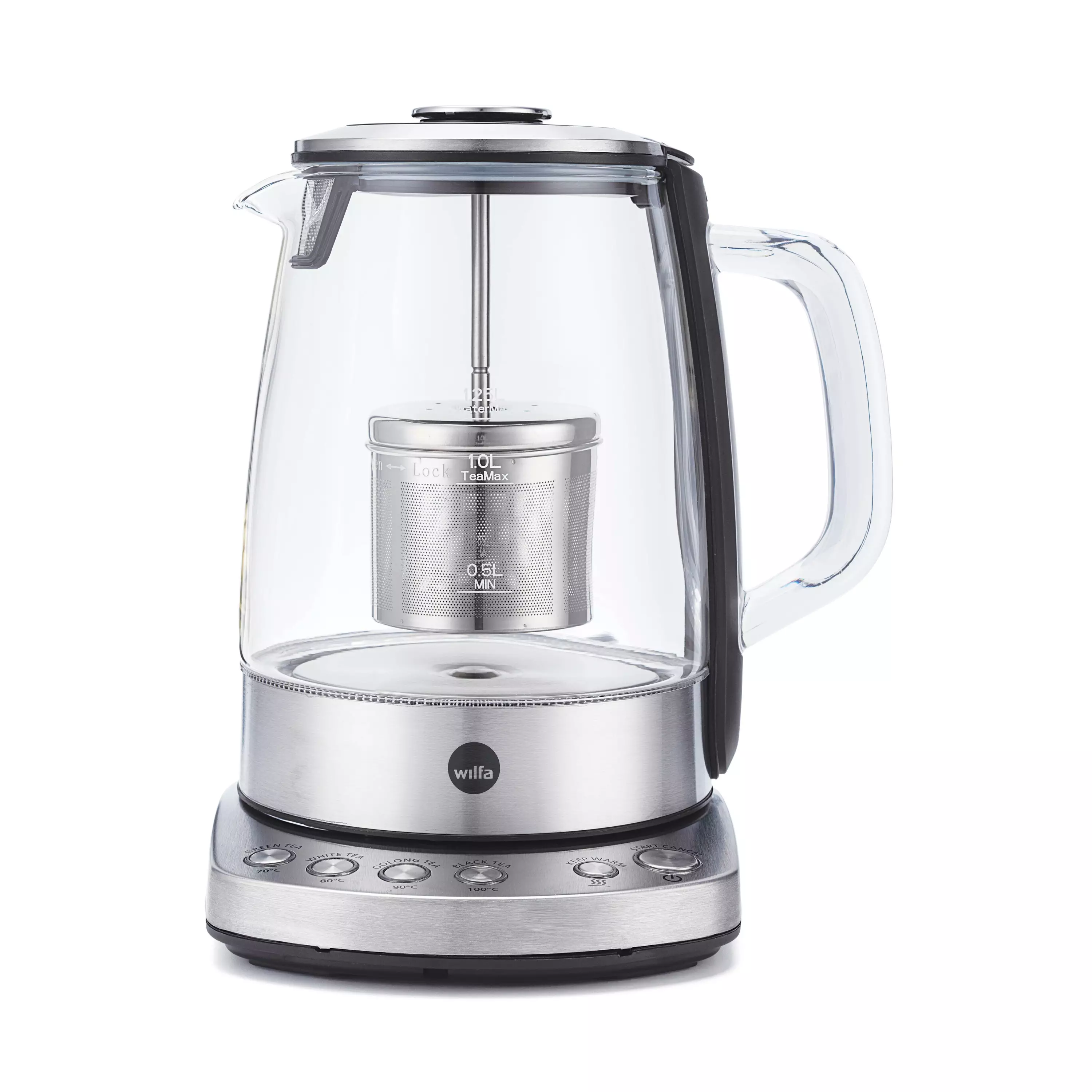 Wilfa CHA keittimessä on kaksi kantta: kansi teesihdillä teen valmistamiseen ja kansi teen tarjoiluun tai kun haluat pelkästään keittää vettä. Tässä lasikannullisessa keittimessä on 1,25 litran tilavuus ja koko keitin on valmistettu lasista ja teräksestä. Wilfa CHA keittimessä on myös lämpimänäpitotoiminto ja tyhjänä kiehumisen esto.
