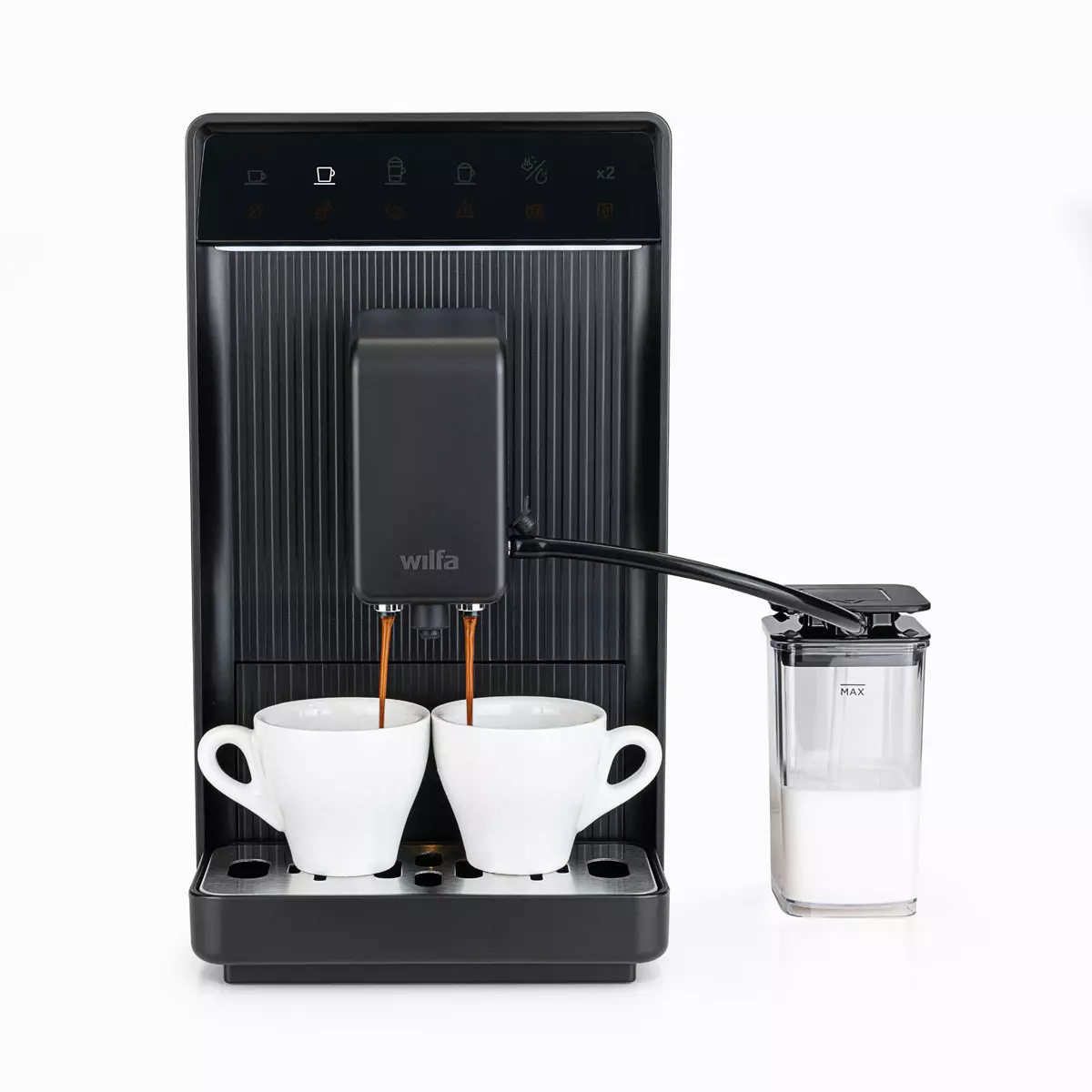 Wilfa Volo Automatic tarjoaa lukuisia juomavaihtoehtoja. Voit valmistaa espresson, lungon, macchiaton, cappuccinon tai latten yhdellä napin painalluksella. Mukana tuleva irrotettava 240 ml maitosäiliö mahdollistaa vaivattoman maitopohjaisten juomien valmistuksen, ja voit säilyttää säiliön helposti jääkaapissa, kun et käytä sitä. Laitteen 2-kupin toiminnolla voit valmistaa kaksi kupillista kerralla – täydellinen ratkaisu, kun sinulla on vieraita tai haluat nauttia enemmän kahvia.