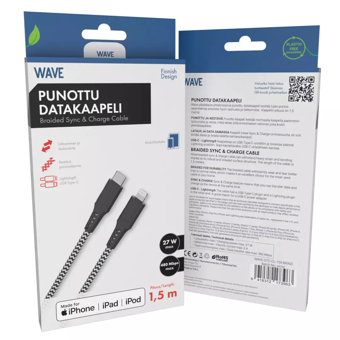 Wave Punottu pikalataava datakaapeli USB Type-C -> Apple Lightning (8pin, MFI) -liitännöillä. Kaapelin pituus 1,5 m ja väri mustavalkoinen. Latausteho 27W, tiedonsiirtonopeus 480 Mbps max. Yhteensopiva Lightning -liitintä käyttävien laitteiden kanssa