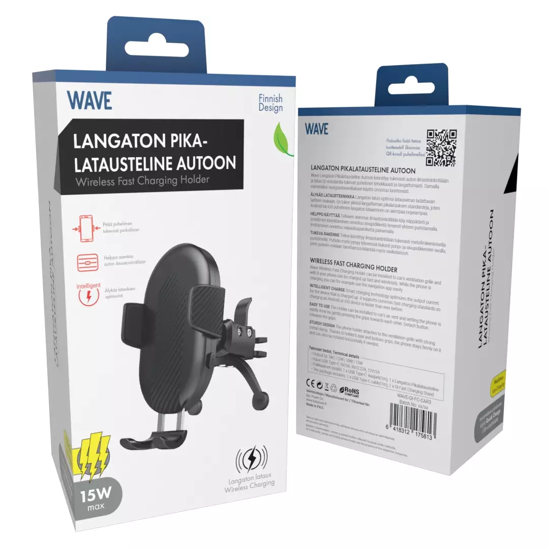 Wave Qi Autoteline langattomalla pikalatauksella (5W, 7,5W ,10W & 15W). Maksimiteho lataukselle 15W. Ladattavan laitteen mukaan itsestään säätyvä latausteho. Kiinnittyy tukevasti auton ilmastointiritilään. Väri: musta.