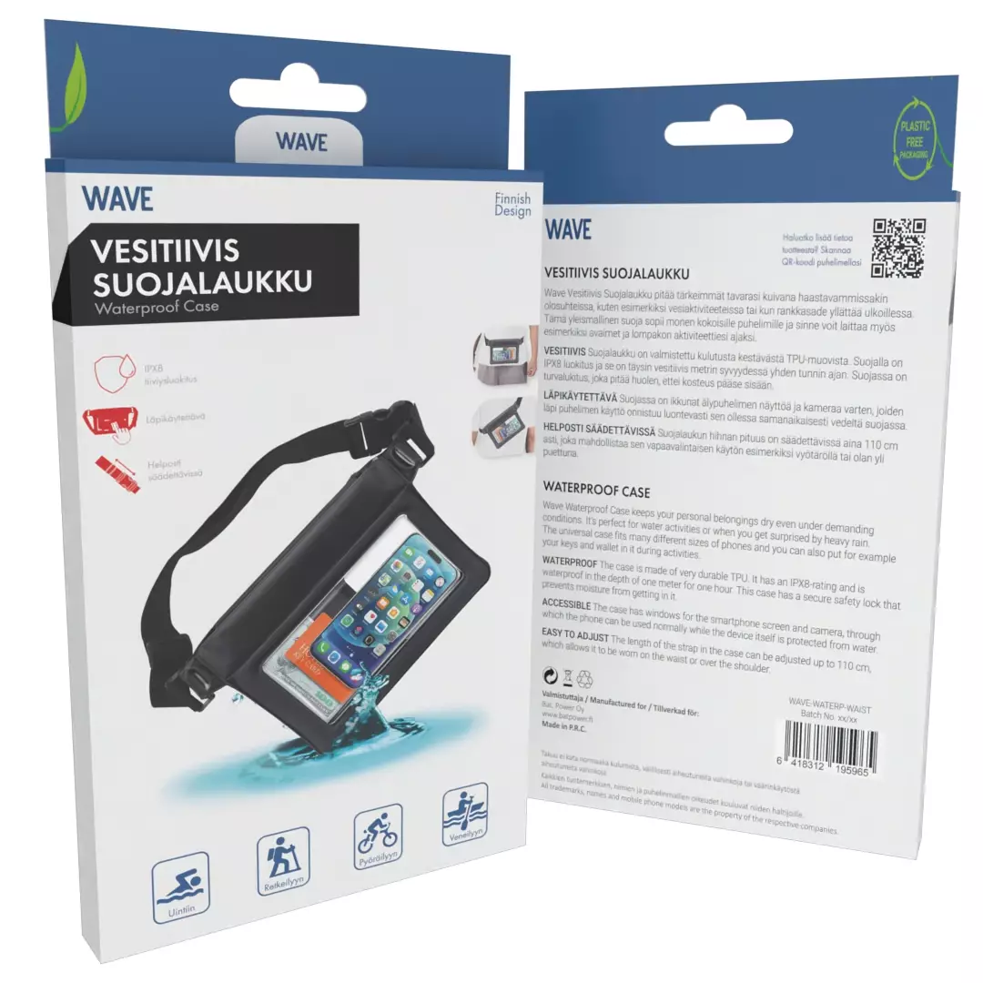 Wave Vesitiivis Suojalaukku pitää tärkeimmät tavarasi kuivana haastavammissakin olosuhteissa, kuten esimerkiksi vesiaktiviteeteissa tai kun rankkasade yllättää ulkoillessa. Tämä yleismallinen suoja sopii monen kokoisille puhelimille ja sinne voit laittaa myös esimerkiksi avaimet ja lompakon aktiviteettiesi ajaksi.