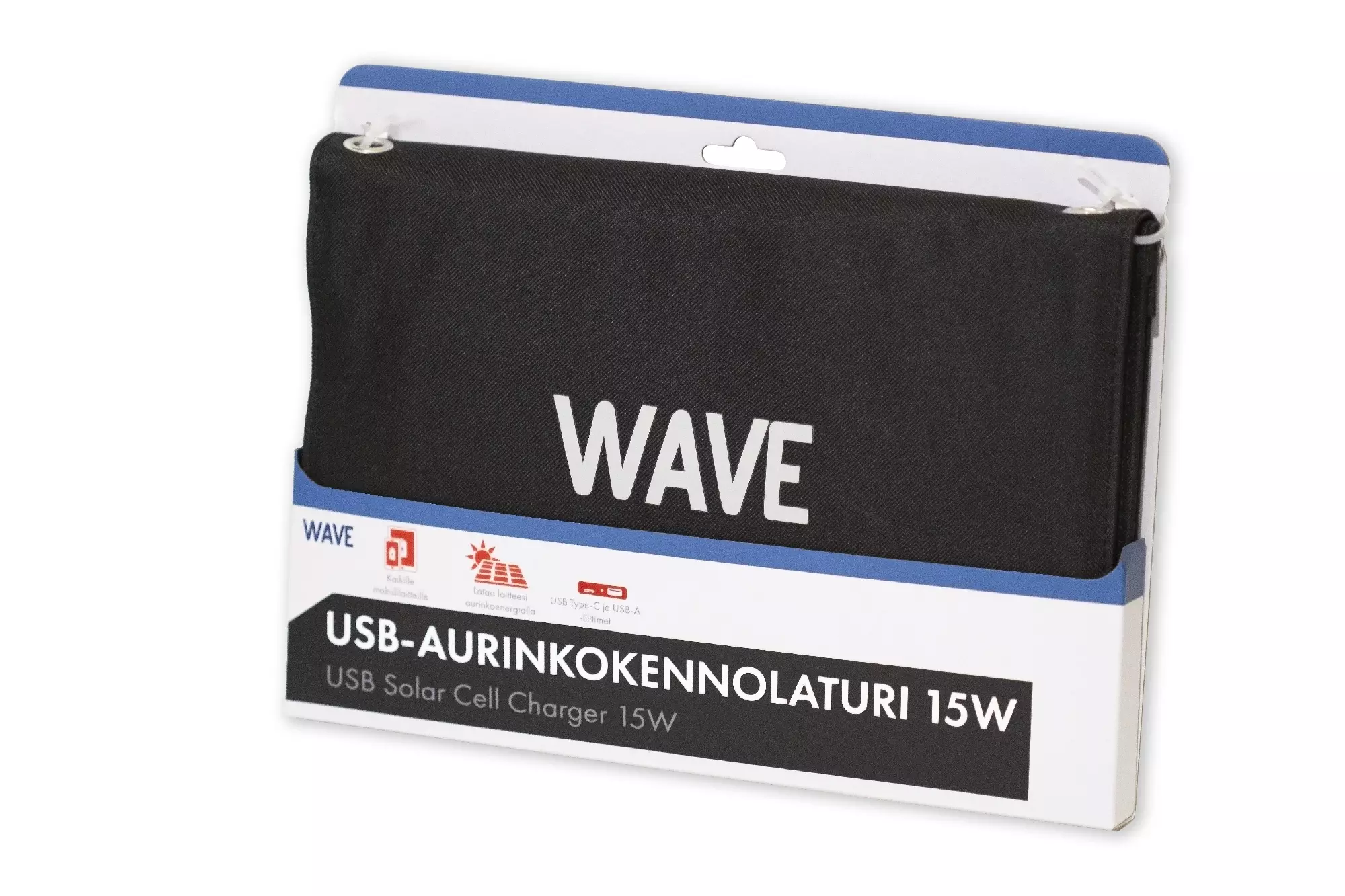 Wave 15W Aurinkokennolaturi yhdellä USB Type-C liitännällä ja yhdellä USB-A liitännällä. Kokonaisteho 15W. Kennot (2 kpl): monokrystalliini. Pintamateriaali: nailon. Väri: musta. Pakkauksessa mukana myös kaksi karabiinikoukkua ripustamista varten.
