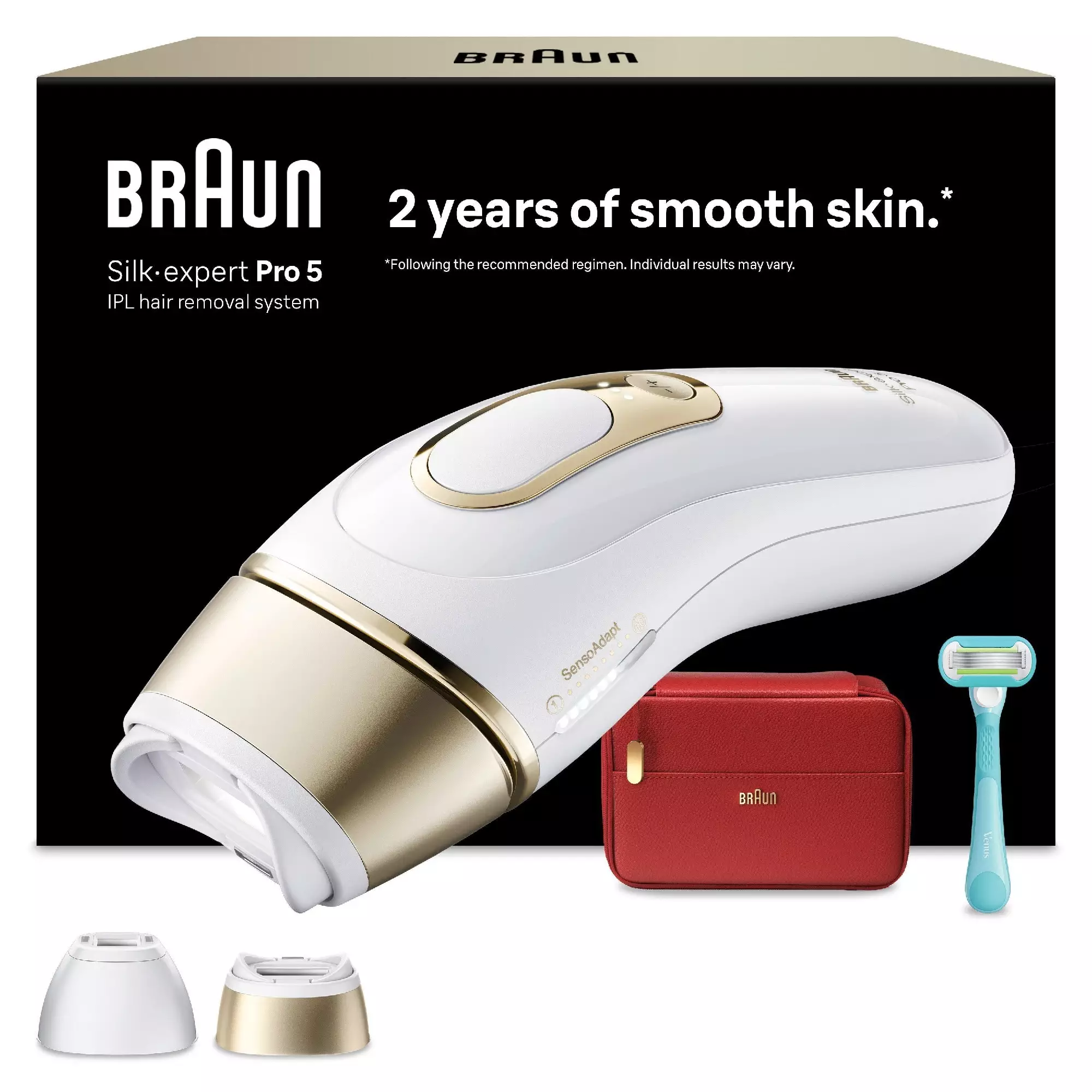 inkluderar: IPL-enhet med smart flex -huvud, 2 utbytbara huvuden, förvaringsväska, Gillette Venus -rakhyvel
