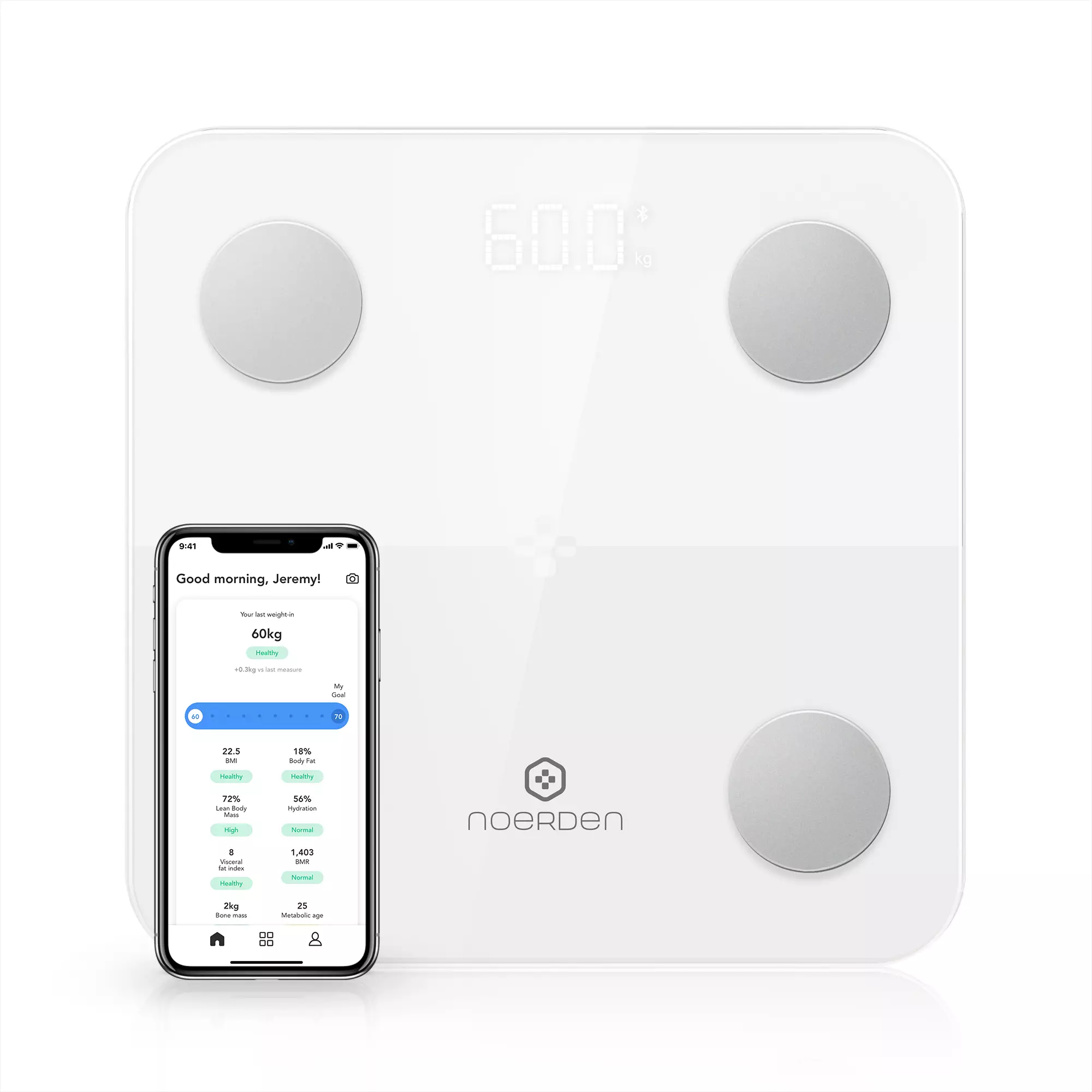 Noerden MINIMI bluetooth älyvaaka mittaa ja analysoi kehonkoostumuksen 9 eri biometrialla. Todellinen hyvinvoinnin ja terveytesi kumppani, MINIMI antaa ohjeita ja vinkkejä Appissa.