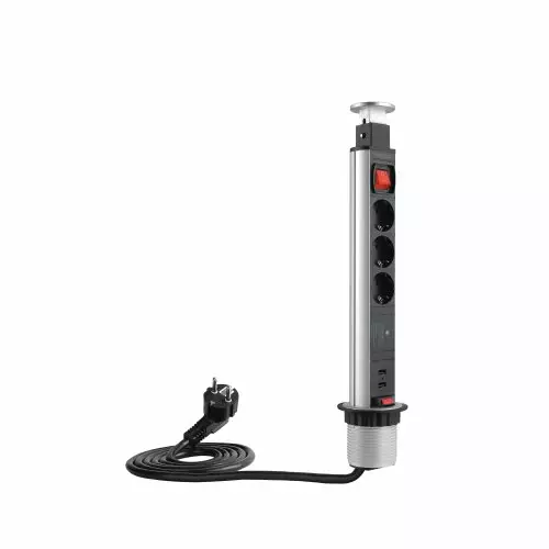 Ylös ponnahtava pöytäjatkojohto, 3 pistorasiaa, 2 USB-liitäntää, ylijännitesuoja, musta/hopea