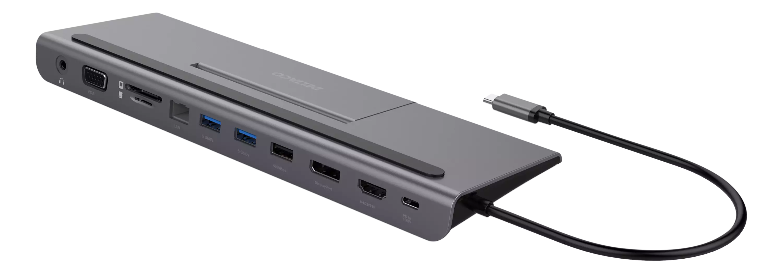Telakka tarjoaa useita liitäntöjä, kuten HDMI-, VGA-, DisplayPort- ja RJ45-verkkoliitännän, 3 x USB-A-porttia, 3,5 mm ääniliitännän (mikrofoni ja kuulokkeet) sekä SD- ja microSD-muistikortinlukijat. Kaikki tämä yhdellä kompaktila, harmaalla designilla varustetulla telakalla. Voit liittää kaiken tarvitsemasi - aina näytöistä verkkoyhteyksiin ja ulkoisiin laitteisiin.
