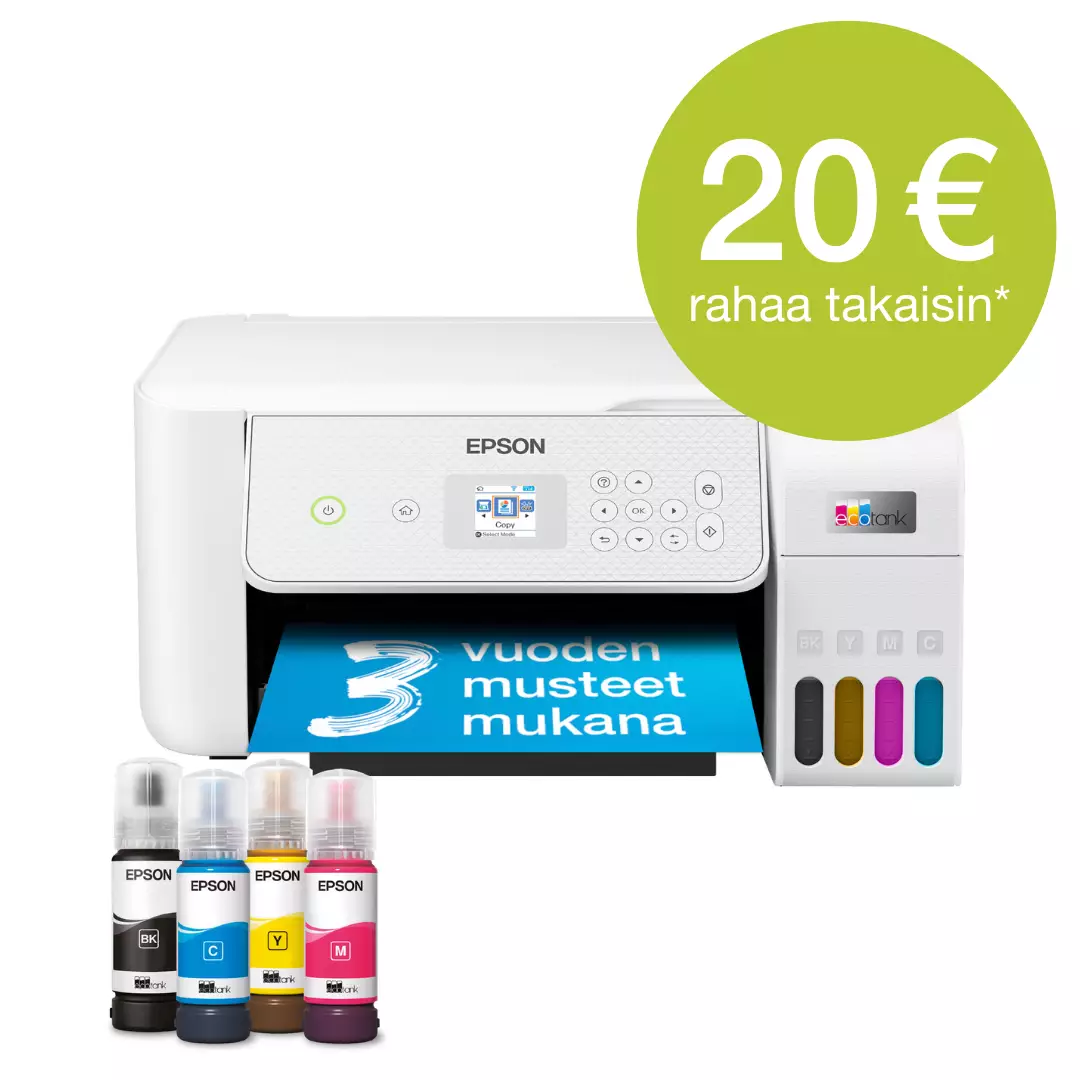 Ostaessasi tämän Epson tulostimen Euronicsilta 1.10.2025. - 31.1.2026. välisenä aikana, saat 20€ rahaa takaisin, kun teet rahanpalautuspyynnön osoitteessa https://www.epson.fi/fi_FI/cashback