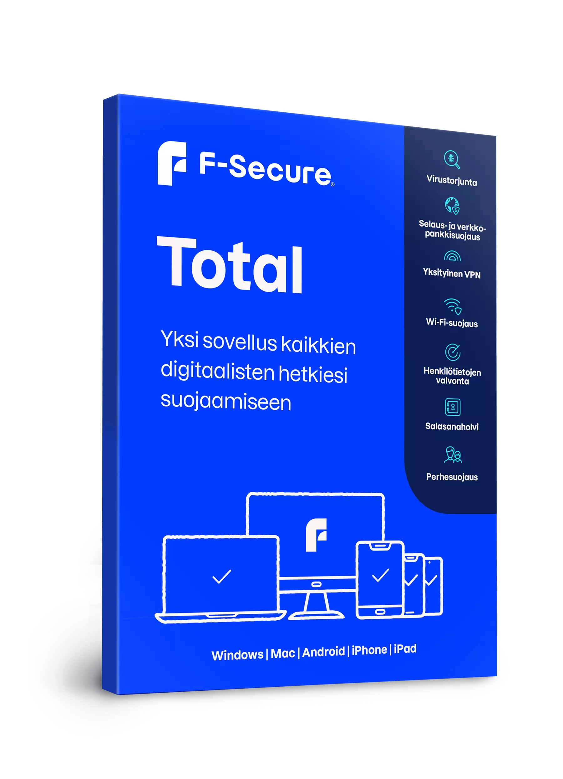 Hanki kattava tietoturva, yksityisyyden ja henkilötietojen suojaus sekä vanhempien käytönvalvontaominaisuudet lapsille F-Secure Totalilla – ja käytä niitä yhdellä ja samalla sovelluksella.