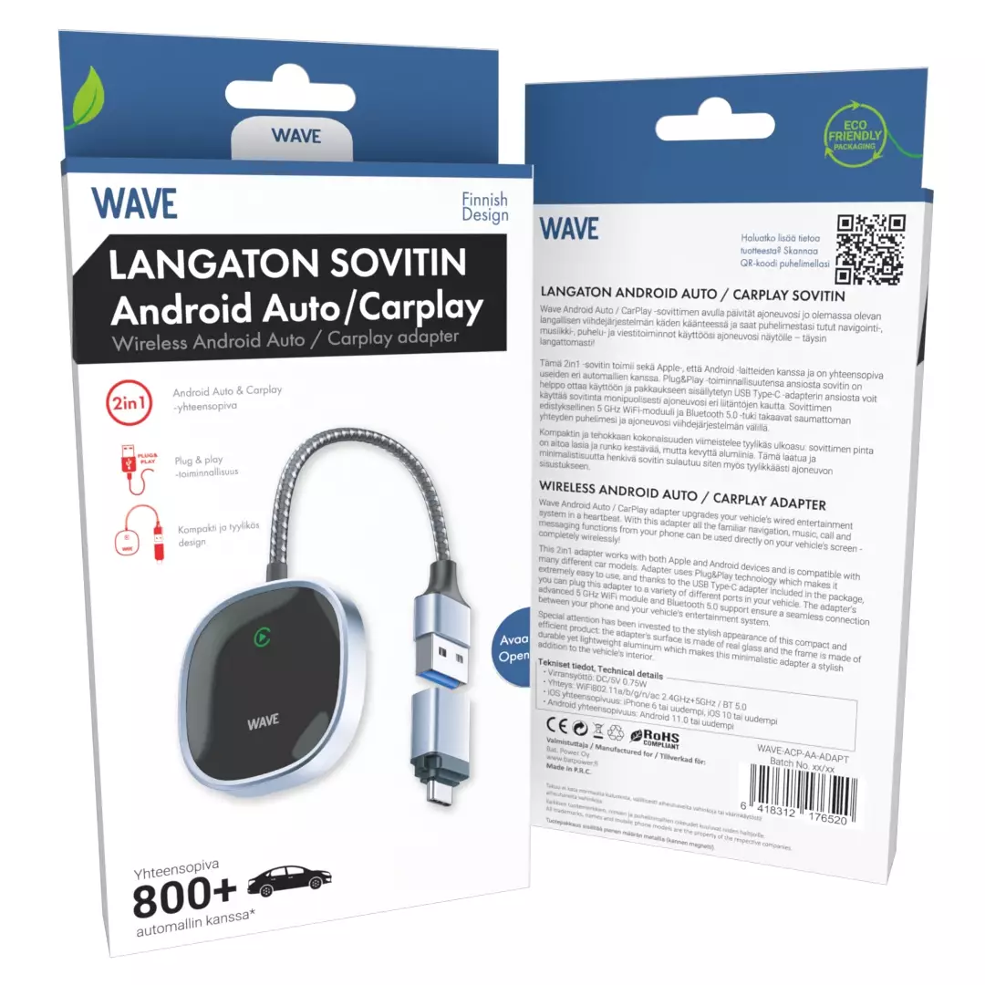 Wave-sovitin on täydellinen valinta sinulle, joka arvostat teknologian helppokäyttöisyyttä, nopeutta ja viimeisteltyä ulkonäköä. Se muuntaa olemassa olevan langallisen CarPlay- tai Android Auto -yhteyden täysin langattomaksi hetkessä – ilman työkaluja tai erillisiä asennuksia. Plug & Play -toiminto varmistaa, että käyttöönotto onnistuu vaikka tien päällä.
